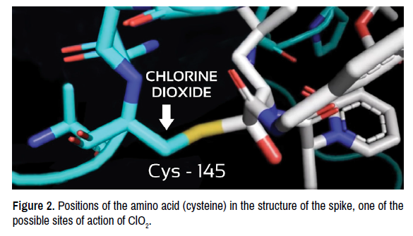 สมมติฐานที่เสนอโดยผู้เขียน Insignares – Carrione และคณะ คือ สาเหตุของฤทธิ์ต้านไวรัสของคลอรีนไดออกไซด์ต่อ SARS-CoV-2 สามารถอธิบายได้จากการออกฤทธิ์ต่อกรดอะมิโนอย่างน้อยห้าชนิด (ซิสเทอีน ทริปโตเฟน ไทโรซีน โพรลีน และไฮดรอกซีโพรลีน)