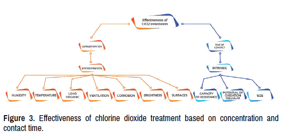 รูปที่ 3 ประสิทธิภาพของการบำบัดด้วยคลอรีนไดออกไซด์โดยพิจารณาจากความเข้มข้นและระยะเวลาสัมผัส