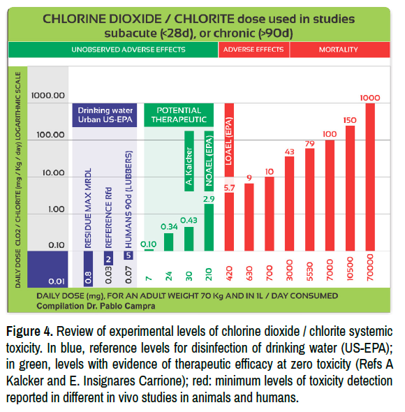รูปที่ 4 การทบทวนระดับความเป็นพิษของคลอรีนไดออกไซด์/คลอไรต์ในระบบร่างกายจากการทดลอง สีน้ำเงินคือระดับอ้างอิงสำหรับการฆ่าเชื้อในน้ำดื่ม (US-EPA) สีเขียวคือระดับที่มีหลักฐานแสดงถึงประสิทธิภาพในการรักษาที่ระดับความเป็นพิษเป็นศูนย์ (อ้างอิง A Kalcker และ E. Insignares Carrione) สีแดงคือระดับต่ำสุดที่ตรวจพบความเป็นพิษตามรายงานในการศึกษาในร่างกายสัตว์และมนุษย์ต่างๆ