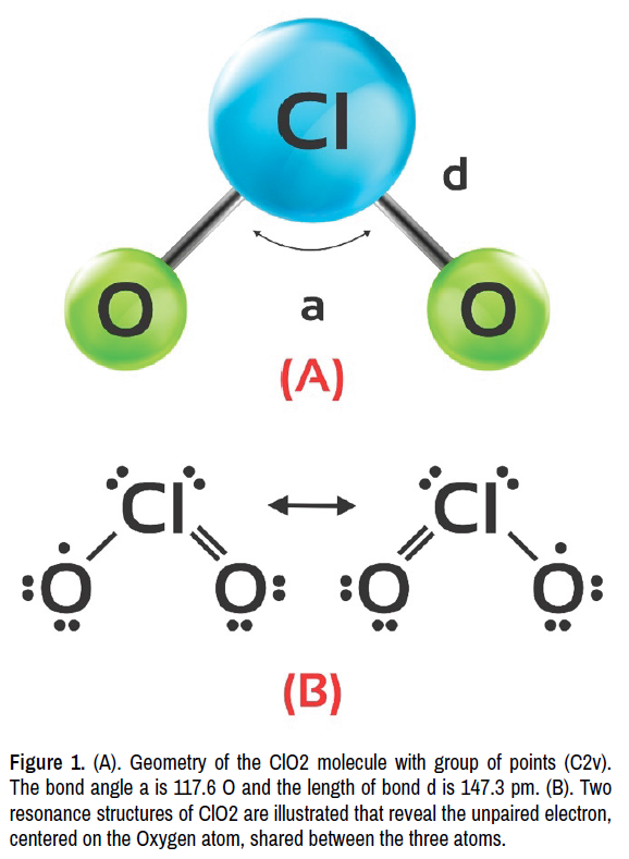 รูปที่ 1. (A). รูปทรงเรขาคณิตของโมเลกุล ClO2 พร้อมกลุ่มจุด (C2v) มุมพันธะ α คือ 117.6° และความยาวพันธะ d คือ 147.3 pm (B). โครงสร้างเรโซแนนซ์สองแบบของ ClO2 แสดงให้เห็นอิเล็กตรอนเดี่ยวที่อยู่ตรงกลางอะตอมออกซิเจน ซึ่งถูกแบ่งปันระหว่างอะตอมทั้งสาม
