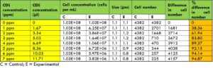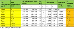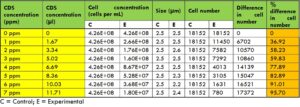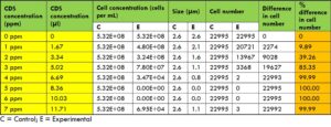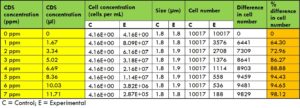 ความเข้มข้นของคลอรีนไดออกไซด์ที่ใช้ในการทดลองมีตั้งแต่ 1.667 μl (1 ppm) ถึง 11.704 μl (7 ppm) โดยเติมลงในหลอดทดลองด้วยปิเปตอิเล็กทรอนิกส์ DLAB และผสมเบาๆ สำหรับแบคทีเรียแต่ละชนิด เตรียมหลอดควบคุมจากอาหารเลี้ยงเชื้อชนิดเดียวกันสำหรับแต่ละหลอดทดลองด้วย ตามปริมาณคลอรีนไดออกไซด์ที่ใช้ในหลอดทดลอง ปริมาณน้ำกลั่นที่เท่ากันถูกเติมลงในหลอดควบคุมเพื่อรักษาระดับการเจือจางให้คงที่ จากหลอดควบคุมและหลอดทดลองเหล่านี้ ตัวอย่าง 6 ไมโครลิตรถูกดูดด้วยปิเปตอิเล็กทรอนิกส์และวางลงบนสไลด์นับเซลล์ M50 สไลด์ถูกนำไปใส่ในเครื่องปั่นเหวี่ยง QUANTOM เป็นเวลา 8 นาที ที่แรงเหวี่ยงสัมพัทธ์ 300 RCF (Relative Centrifugal Force) จากนั้นจึงนำไปใส่ในเครื่องนับเซลล์จุลินทรีย์ QUANTOM เพื่อวัดค่าพื้นฐาน (ควบคุม) และวัดค่าอีกครั้งจากหลอดทดลอง การตั้งค่าเครื่องนับเซลล์จุลินทรีย์ QUANTOM ที่เหมาะสมที่สุดสำหรับแบคทีเรียชนิดต่างๆ ถูกตั้งค่าตามรูปร่างและขนาดของแบคทีเรียแต่ละชนิดเพื่อเพิ่มประสิทธิภาพในการนับ