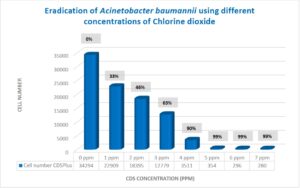 เมื่อใช้ Acinetobacter baumannii พบว่ามีการฆ่าเชื้อได้ 99% ที่ความเข้มข้นของคลอรีนไดออกไซด์ 5, 6 และ 7 ppm (t-test, p<0.01) (ตารางที่ 1, ภาพที่ 2)