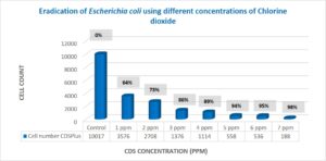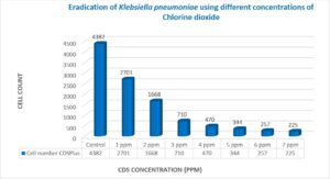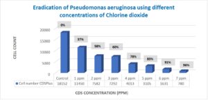 เพื่อประเมินศักยภาพในการฆ่าเชื้อของคลอรีนไดออกไซด์ต่อแบคทีเรียดื้อยาปฏิชีวนะ 5 ชนิดในงานวิจัยนี้ ใช้หลอดบรรจุ CDSpure ขนาด 5 มล. ตลอดการทดลอง เนื่องจากหลอดเหล่านี้มีความเข้มข้นมาตรฐาน 2,990 ppm ความเข้มข้นที่ใช้คือ 1 ppm ถึง 7 ppm โดยเพิ่มขึ้นทีละ 1 ppm ตัวอย่างควบคุมและตัวอย่างทดลองที่ความเข้มข้นต่างๆ ทำซ้ำ 3 ครั้ง แล้วนำค่าเฉลี่ยมาเปรียบเทียบกับตัวอย่างควบคุมที่ไม่มีคลอรีนไดออกไซด์ CDSpure โดยทั่วไปแล้ว ในแบคทีเรียทั้ง 5 ชนิด พบว่ามีการฆ่าเชื้อมากกว่า 95% ที่ความเข้มข้นสูงสุด 7 ppm ของคลอรีนไดออกไซด์ โดยบางชนิดถูกกำจัดได้ที่ความเข้มข้นต่ำกว่า 4–7 ppm (การทดสอบ t-test, p<0.01)