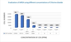 งานวิจัยนี้มุ่งเน้นศึกษาประสิทธิภาพของคลอรีนไดออกไซด์ในหลอดทดลองต่อแบคทีเรียดื้อยาปฏิชีวนะที่สำคัญที่สุดบางชนิด ซึ่งเป็นสาเหตุของการเสียชีวิตหลายล้านคนต่อปีทั่วโลก เราได้แสดงให้เห็นว่าความเข้มข้นของคลอรีนไดออกไซด์ที่เหมาะสมที่สุดซึ่งส่งผลให้เกิดการฆ่าเชื้อเกือบสมบูรณ์ในหลอดทดลองคือ 7 ppm (p<0.01) นี่เป็นปริมาณที่ปลอดภัยเนื่องจากเป็นปริมาณใกล้เคียงกับที่ใช้ในการบำบัดน้ำ สิ่งที่สังเกตได้ในหลอดทดลองน่าจะพบได้ในร่างกายมนุษย์เช่นกัน เช่นเดียวกับเลือด คลอรีนไดออกไซด์จะปล่อยออกซิเจนเมื่อพบกับความเป็นกรด ไม่ว่าจะเป็นจากกรดแลคติกหรือความเป็นกรดของจุลินทรีย์ เมื่อคลอรีนไดออกไซด์แตกตัว มันจะปล่อยออกซิเจนเข้าสู่กระแสเลือด เช่นเดียวกับเม็ดเลือดแดง โดยใช้หลักการเดียวกัน (ที่รู้จักกันในชื่อปรากฏการณ์โบห์ร) ซึ่งก็คือการเลือกตอบสนองต่อความเป็นกรด
