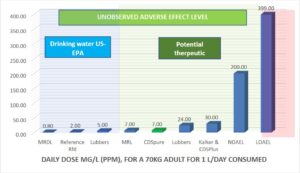ภาพที่ 1 แสดงระดับอ้างอิงสำหรับการฆ่าเชื้อในน้ำดื่มจากสำนักงานคุ้มครองสิ่งแวดล้อมแห่งสหรัฐอเมริกา (โซนสีฟ้า) ระดับประสิทธิภาพในการรักษาที่อาจเกิดขึ้นในสัตว์ทดลองที่ระดับความเป็นพิษเป็นศูนย์แสดงอยู่ในโซนสีเขียว ระดับที่เป็นพิษแสดงอยู่ในโซนสีแดง (สูงกว่า 399 ppm) ระดับ 5 ppm ที่กำจัดแบคทีเรียดื้อยาปฏิชีวนะได้ 99% หรือมากกว่าในงานวิจัยนี้ อยู่ภายในพื้นที่สีฟ้า/เขียวซึ่งมีความเป็นพิษเป็นศูนย์