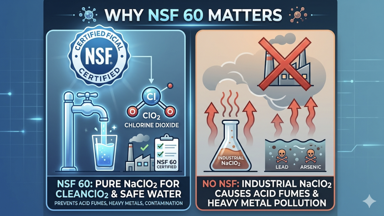 ในการผลิตก๊าซคลอรีนไดออกไซด์ (ClO2) จากโซเดียมคลอไรต์ (NaClO2) มักมีคำถามเชิงเทคนิคว่า “หากเราแยกก๊าซออกมาใช้เพียงอย่างเดียว โดยไม่ให้สารละลายสัมผัสกับน้ำดื่มโดยตรง เรายังจำเป็นต้องใช้สารเคมีเกรดอุตสาหกรรมที่มีราคาถูกกว่าหรือไม่?”