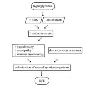 ความเครียดออกซิเดชันที่เพิ่มขึ้นจะกระตุ้นการทำงานของเส้นทางการส่งสัญญาณหลายเส้นทางที่เกี่ยวข้องกับการเกิดโรคของแผลเบาหวาน ซึ่งรวมถึงการกระตุ้นเส้นทางโพลีออล (Pang, 2020) การผลิต AGEs และ RAGEs ที่เพิ่มขึ้นการกระตุ้นระบบโปรตีนไคเนสซี (PKC) (Aronson และ Rayfield, 2002) การทำงานมากเกินไปของเส้นทางเฮกโซซามีน (Aronson, 2008) การปล่อยไซโตไคน์ที่ก่อให้เกิดการอักเสบ (Rask-Madsen และ King, 2013; Thiruvoipati et al., 2015) และการยับยั้งเอนไซม์ต้านหลอดเลือดแข็งตัว เช่น eNOS และพรอสตาไซคลินซินเทส ผ่านกลไกเหล่านี้ ความเครียดจากออกซิเดชันจะลดระดับไนตริกออกไซด์ ทำลายโปรตีนในเซลล์ ส่งเสริมการยึดเกาะของเม็ดเลือดขาวกับเยื่อบุหลอดเลือด และเพิ่มการอักเสบ (Sheetz and King, 2002) การเปลี่ยนแปลงเหล่านี้ส่งเสริมการพัฒนาของหลอดเลือดแดงแข็ง ซึ่งนำไปสู่โรคหลอดเลือดแดงส่วนปลาย (PAD) ภาวะขาดเลือด และในที่สุดก็ทำให้เกิดแผลเบาหวาน