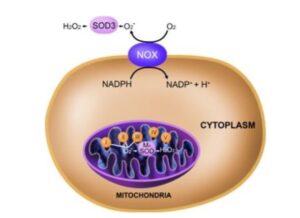 ROS ถูกสร้างขึ้นโดยเซลล์หลอดเลือดทุกชนิด แต่แหล่งกำเนิดหลักสองแหล่งในหลอดเลือดคือห่วงโซ่การขนส่งอิเล็กตรอนของไมโทคอนเดรียและนิโคตินาไมด์อะดีนีนไดนิวคลีโอไทด์ฟอสเฟต (NADPH) ออกซิเดส (NOX) NOX สร้างซูเปอร์ออกไซด์โดยการถ่ายโอนอิเล็กตรอนจาก NADPH ไปยังออกซิเจน ไมโทคอนเดรียผลิตซูเปอร์ออกไซด์ผ่านห่วงโซ่การขนส่งอิเล็กตรอน (ETC) และซูเปอร์ออกไซด์จะถูกเปลี่ยนเป็นไฮโดรเจนเปอร์ออกไซด์ (H2O2) โดยเอนไซม์ซูเปอร์ออกไซด์ดิสมิวเทส (SOD2) (ภาพที่ 2)
