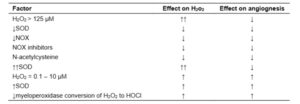 ไฮโดรเจนเปอร์ออกไซด์มีอิทธิพลต่อการสมานแผลผ่านกลไกหลายประการ ซึ่งรวมถึงการเปลี่ยนแปลงการสร้างหลอดเลือดใหม่ การแทรกซึมของนิวโทรฟิล การเคลื่อนที่ของไฟโบรบลาสต์ และการกระตุ้นไมโอไฟโบรบลาสต์ (Fujiwara et al., 2013) ผลกระทบของไฮโดรเจนเปอร์ออกไซด์ต่อการสมานแผลบางส่วนขึ้นอยู่กับความเข้มข้น ตัวอย่างเช่น ความเข้มข้นต่ำ (0.1-10 μM) ส่งเสริมการสร้างหลอดเลือดใหม่ ในขณะที่ความเข้มข้นสูง (>125 μM) ยับยั้งการสร้างหลอดเลือดใหม่และทำให้เซลล์เยื่อบุหลอดเลือดเสียหาย (Huang and Zheng, 2006; Yasuda et al., 1998) ปัจจัยที่ส่งผลต่อระดับไฮโดรเจนเปอร์ออกไซด์และส่งผลต่อการสร้างหลอดเลือดใหม่แสดงอยู่ในตารางที่ 1