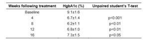 ตารางที่ 2 การลดลงของระดับ Hgb A1c หลังการรักษาด้วยคลอไรต์ (WF10)*