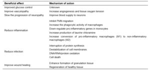 คลอรีนไดออกไซด์/คลอไรต์มีฤทธิ์หลายประการที่อาจช่วยส่งเสริมการสมานแผลเบาหวานได้ ผลดีเหล่านี้ได้แก่ การควบคุมระดับน้ำตาลในเลือดที่ดีขึ้น (Maraprygsavan et al., 2016; Yingsakmongkol et al., 2021), การลดการผลิตไอออนซูเปอร์ออกไซด์ในขณะที่เพิ่มการผลิตไฮโดรเจนเปอร์ออกไซด์ (Tissot et al., 1990), การเพิ่มความดันออกซิเจนในเนื้อเยื่อ (Tissot et al., 1990), การลดการอักเสบ (Giese et al., 2004; Schönberg et al., 2016; Tissot et al., 1990; Yingsakmongkol, 2013), ผลต้านจุลชีพ (Alvarez and O’Brien, 1982; Benarde et al., 1965; Sanekata et al., 2010; Zu et al., 2019) และการสมานแผลที่ดีขึ้น (อัล-บายาตี และอับดุลลา, 2012; Hinz et al., 1986; เคนยอน และคณะ 1986; วิลกินส์ 2014; ยิ่งศักดิ์มงคล และคณะ 2011)