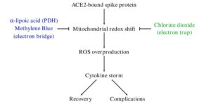 ภาพที่ 1 กลไกที่เสนอซึ่งกรดอัลฟาไลโปอิก (ALA) เมทิลีนบลู (MeB) และคลอรีนไดออกไซด์ออกฤทธิ์ในการรักษา COVID-19 และภาวะแทรกซ้อนหลังระยะเฉียบพลัน ALA จับคู่กับเอนไซม์ไพรูเวตดีไฮโดรจีเนสคอมเพล็กซ์ (PDH); MeB ทำหน้าที่เป็นสะพานอิเล็กตรอนระหว่างตัวให้ (FADH2, FMNH, NADH) และโมเลกุลตัวรับ เช่น ออกซิเจน และโมเลกุล ClO2 ดักจับอิเล็กตรอนห้าตัว ทำให้เป็นกับดักอิเล็กตรอนแบบครั้งเดียว