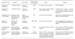 ในแง่ของการใช้ ClO2 ในบริบทของ COVID-19 การศึกษาส่วนใหญ่คล้ายคลึงกันเกี่ยวกับสิ่งแวดล้อม มีการศึกษาในมนุษย์เพียงจำกัด (ตารางที่ 1) Aparicio-Alonso และคณะ ให้ ClO2 ทางปากที่ 3 ppm เป็นสารป้องกันแก่สมาชิกในครอบครัวที่อาศัยอยู่กับผู้ป่วย COVID-19 ในเม็กซิโก พวกเขาพบว่า ClO2 มีประสิทธิภาพในการป้องกัน COVID-19 และไม่มีรายงานเหตุการณ์ไม่พึงประสงค์ใดๆ ในการศึกษาอีกฉบับหนึ่ง Aparicio-Alonso และคณะ ให้ยาทางปากในปริมาณเฉลี่ย 1.41 มก./กก. เพื่อรักษาผู้ป่วย COVID-19 พวกเขาพบว่า ClO2 ช่วยบรรเทาอาการของ COVID-19 และลดระยะเวลาการรักษา มีเพียง 6.78% ของผู้ป่วยที่รายงานอาการไม่พึงประสงค์เล็กน้อยและเกิดขึ้นเป็นครั้งคราว เช่น ปวดหัว เวียนศีรษะ อาเจียน ท้องเสีย และคลื่นไส้ ดังนั้นพวกเขาจึงสรุปว่า ClO2 อาจถือได้ว่าเป็นทางเลือกการรักษาที่ปลอดภัยสำหรับการรักษา COVID-19