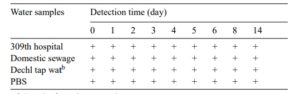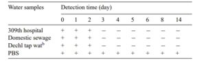 ไวรัส SARS-CoV คงอยู่ได้เพียง 2 วันในน้ำเสียจากโรงพยาบาล น้ำเสียจากครัวเรือน และน้ำประปาที่ผ่านการกำจัดคลอรีนแล้ว ที่อุณหภูมิ 20 ◦C (ตารางที่ 1) เมื่อตรวจหาดีเอ็นเอของไวรัสด้วยวิธี RTPCR พบว่ายังสามารถตรวจพบ RNA ได้ในวันที่ 7 แม้ว่าจำนวนสำเนาของ RNA จะมีน้อยมากจนต้องตรวจหาด้วยวิธี nested PCR (รูปที่ 1) ที่อุณหภูมิ 4 ◦C ไวรัส SARS-CoV ในตัวอย่างเหล่านี้ สามารถคงอยู่ได้นานถึง 14 วัน (ตารางที่ 2)