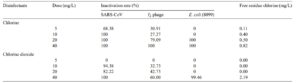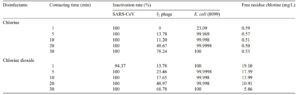 ไวรัส SARS-CoV สามารถถูกทำลายได้อย่างสมบูรณ์ด้วยคลอรีน 10 มก./ลิตร เป็นเวลา 10 นาทีขึ้นไป ภายใต้สภาวะเดียวกัน แบคทีเรีย E. coli และฟาจ f2 ไม่สามารถถูกทำลายได้อย่างมีประสิทธิภาพ แม้ว่าคลอรีนไดออกไซด์จะมีประสิทธิภาพในการทำลาย E. coli และฟาจ f2 เกือบเท่ากับคลอรีนที่ความเข้มข้นนี้ แต่ก็มีประสิทธิภาพน้อยกว่าในการทำลาย SARS-CoV ปริมาณคลอรีนอิสระที่เหลืออยู่ ณ เวลาต่างๆ ถูกรักษาไว้ที่ประมาณ 0.4 มก./ลิตร แต่ปริมาณคลอรีนไดออกไซด์อิสระที่เหลืออยู่ต่ำกว่าค่าที่ตรวจจับได้ (ตารางที่ 5)