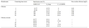 ความเข้มข้นของคลอรีนอยู่ที่ 20 มก./ลิตร และคลอรีนไดออกไซด์อยู่ที่ 40 มก./ลิตร SARS-CoV 101.75 TCID50/มล. f2 2.9 × 10⁵ pfu/ลิตร; E. coli 5.5 × 10⁵ cfu/ลิตร; อุณหภูมิ 20 ◦C ผลลัพธ์จากการทดลอง 3 ครั้ง