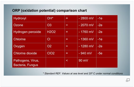 ค่าความเป็นออกซิไดซ์-รีดักซ์ (ORP) ของก๊าซคลอรีนไดออกไซด์ (ClO₂) ถูกบันทึกไว้ที่ 0.94 โวลต์ ซึ่งต่ำกว่าช่วงปกติที่พบในเซลล์ของมนุษย์ (1.2 ถึง 1.5 โวลต์) ซึ่งบ่งชี้ว่า ภายใต้สภาวะทางสรีรวิทยาปกติ คลอรีนไดออกไซด์มีความรุนแรงน้อยกว่าและไม่เป็นอันตรายต่อเซลล์มนุษย์