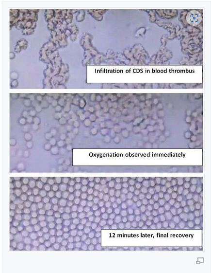 เมื่อคลอรีนไดออกไซด์ถูกใช้กับเลือดที่สูญเสียออกซิเจนและถูกตรวจสอบภายใต้กล้องจุลทรรศน์ จะสังเกตได้ว่าเซลล์เม็ดเลือดแดงหรืออีริโทรไซต์ จัดเรียงตัวอย่างเป็นระเบียบหลังจากสัมผัสกันเพียงไม่กี่นาที ปรากฏการณ์ที่น่าทึ่งนี้อาจเกิดจากการหมุนเวียนของอิเล็กตรอนที่เกิดขึ้นภายในโครงสร้างหกเหลี่ยมของโมเลกุลคลอรีนไดออกไซด์ ซึ่งเอื้อต่อการจัดเรียงตัวอย่างมีระเบียบ งานวิจัยได้แสดงให้เห็นว่าการปฏิสัมพันธ์นี้สามารถมีอิทธิพลต่อรูปร่างและการทำงานของอีริโทรไซต์ ซึ่งอาจช่วยเพิ่มการส่งออกซิเจนไปยังเนื้อเยื่อได้ เราสังเกตเห็นการเพิ่มขึ้นของ Z