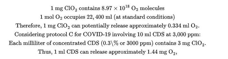 น้ำหนักโมเลกุลของ ClO₂ คือ 67 กรัม/โมล ในขณะที่น้ำหนักโมเลกุลของ O₂ คือ 32 กรัม/โมล ดังนั้น ออกซิเจนจึงประกอบประมาณ 48% ของน้ำหนักโมเลกุลของ ClO₂ ดังนั้น 1 มก. ของ ClO₂ จะมีออกซิเจนประมาณ 0.48 มก.