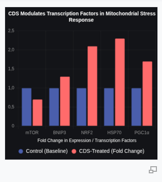 ข้อมูลจากการศึกษาชี้ให้เห็นว่า CDS เพิ่มระดับ PGC1α (1.7 เท่า) ส่งเสริมการสร้างไมโทคอนเดรียใหม่ และเพิ่ม NRF2 (2.1 เท่า) เสริมสร้างการป้องกันแอนติออกซิแดนท์ เราเสนอว่า CDS เตรียมความพร้อมให้ไมโทคอนเดรียโดยการกำจัดแลคเตท ทำให้พลังงานเยื่อหุ้มคงที่ (ΔΨm) และขยายสัญญาณ Ca²⁺ ซึ่งช่วยเพิ่มการแสดงออกของยีนปรับตัว แบบจำลองสมมุติฐานทำนายว่า CDS ที่ 15 ppm จะลดระดับแลคเตทภายในเซลล์ที่เครียดลง 15% และเพิ่มการผลิต ATP ขึ้น 12%