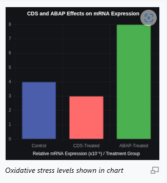 ความหมาย: กลุ่มที่ได้รับการรักษาด้วย ABAP แสดงการแสดงออกของ mRNA สูงอย่างมีนัยสำคัญเมื่อเทียบกับกลุ่มควบคุม ABAP เป็นที่ทราบกันดีว่าเป็นสารกระตุ้นความเครียดจากออกซิเดชัน ซึ่งอาจอธิบายได้ว่าทำไมการแสดงออกของยีนจึงเพิ่มขึ้นเพื่อรับมือกับความเครียดนี้