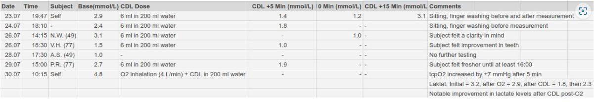 ตัวอย่างเช่น บุคคลอายุ 77 ปี มีค่าลาแล็กเตตพื้นฐานอยู่ที่ 2.9 mmol/L เมื่อวันที่ 23 กรกฎาคม 2023 หลังจากดื่มสารละลายคลอรีนไดออกไซด์: