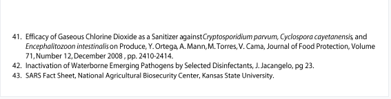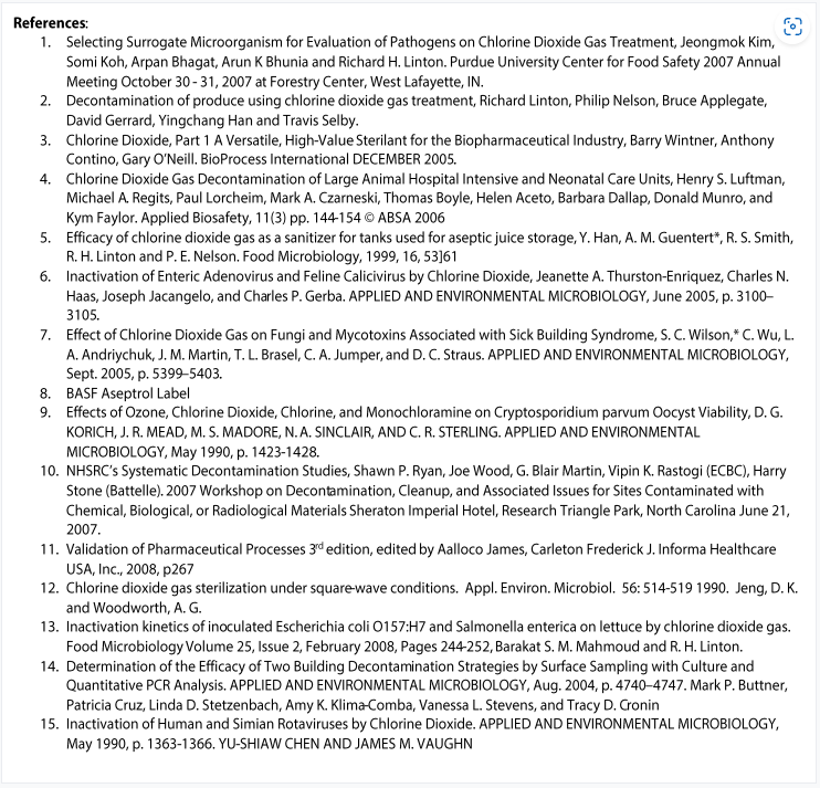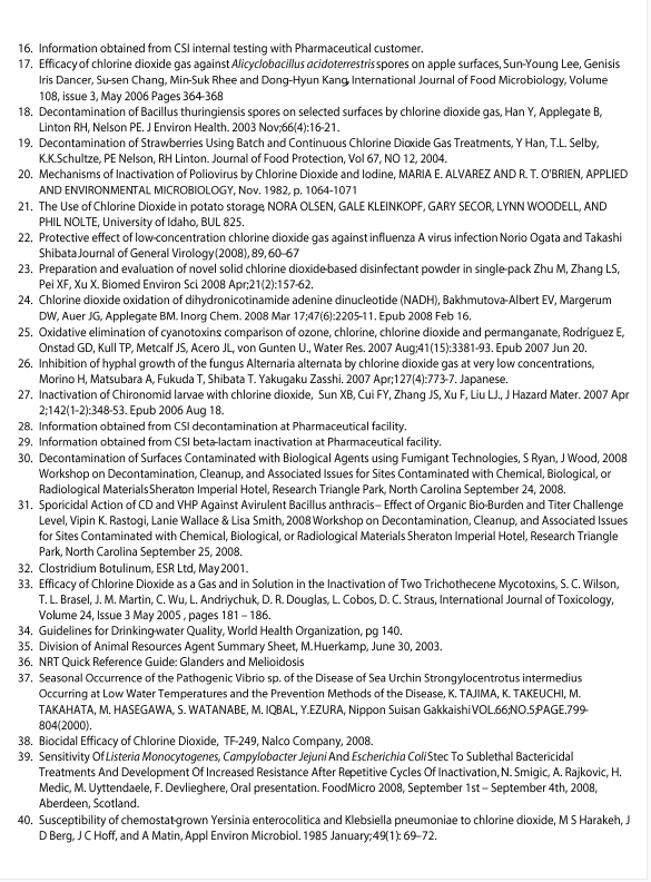 หน้านี้แสดงรายชื่อเชื้อโรคและตัวแทนที่ทราบซึ่งถูกกำจัดโดย ClO2 ตัวเลขนับเป็นหมายเลขอ้างอิงของเอกสาร/งานวิจัยที่ตีพิมพ์